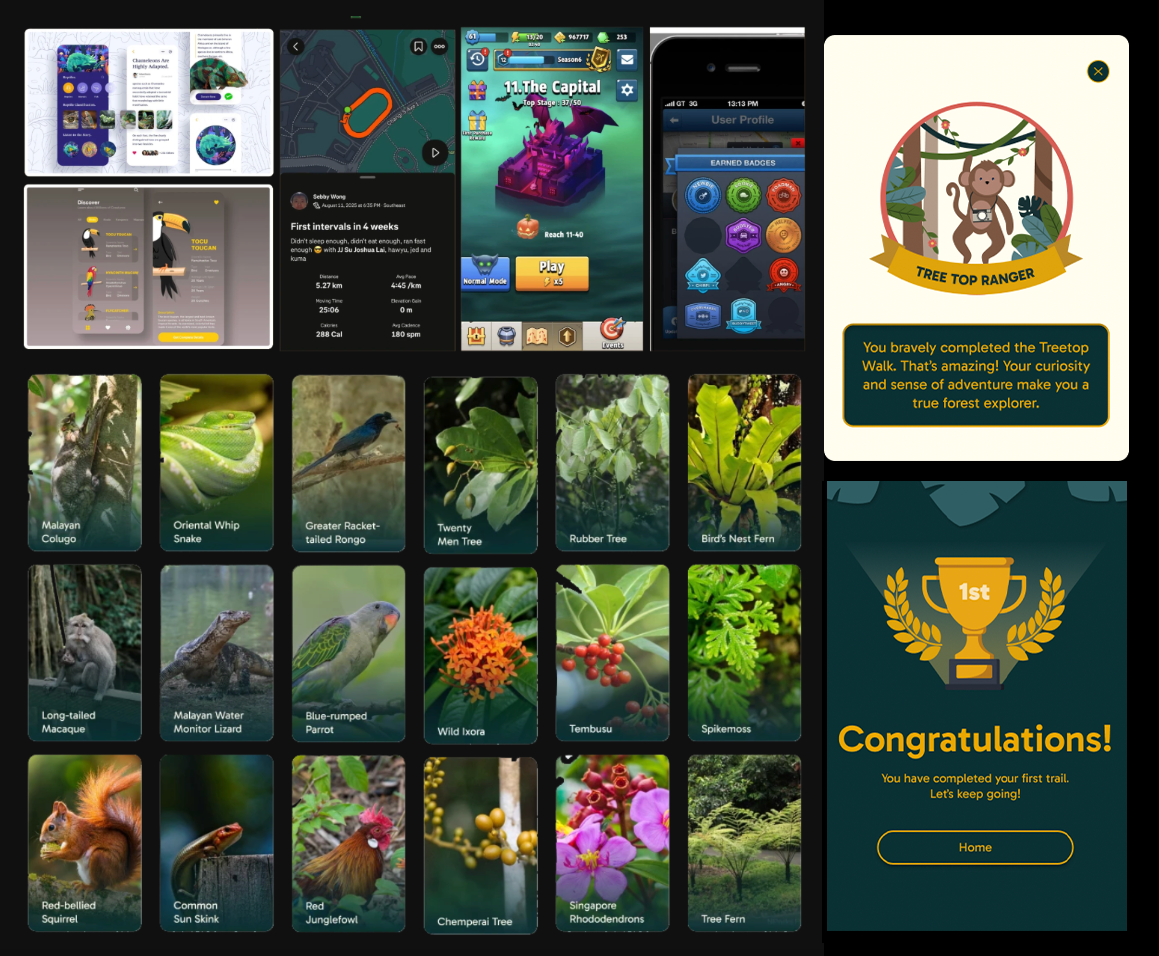 warm colours, and friendly language create an inviting experience, while the badge system uses fun, ranger-style names — like Junior Bird Watcher and Tree Top Ranger — to connect real MacRitchie species with imaginative exploration. This approach turns learning into a light-hearted adventure that families can enjoy together.