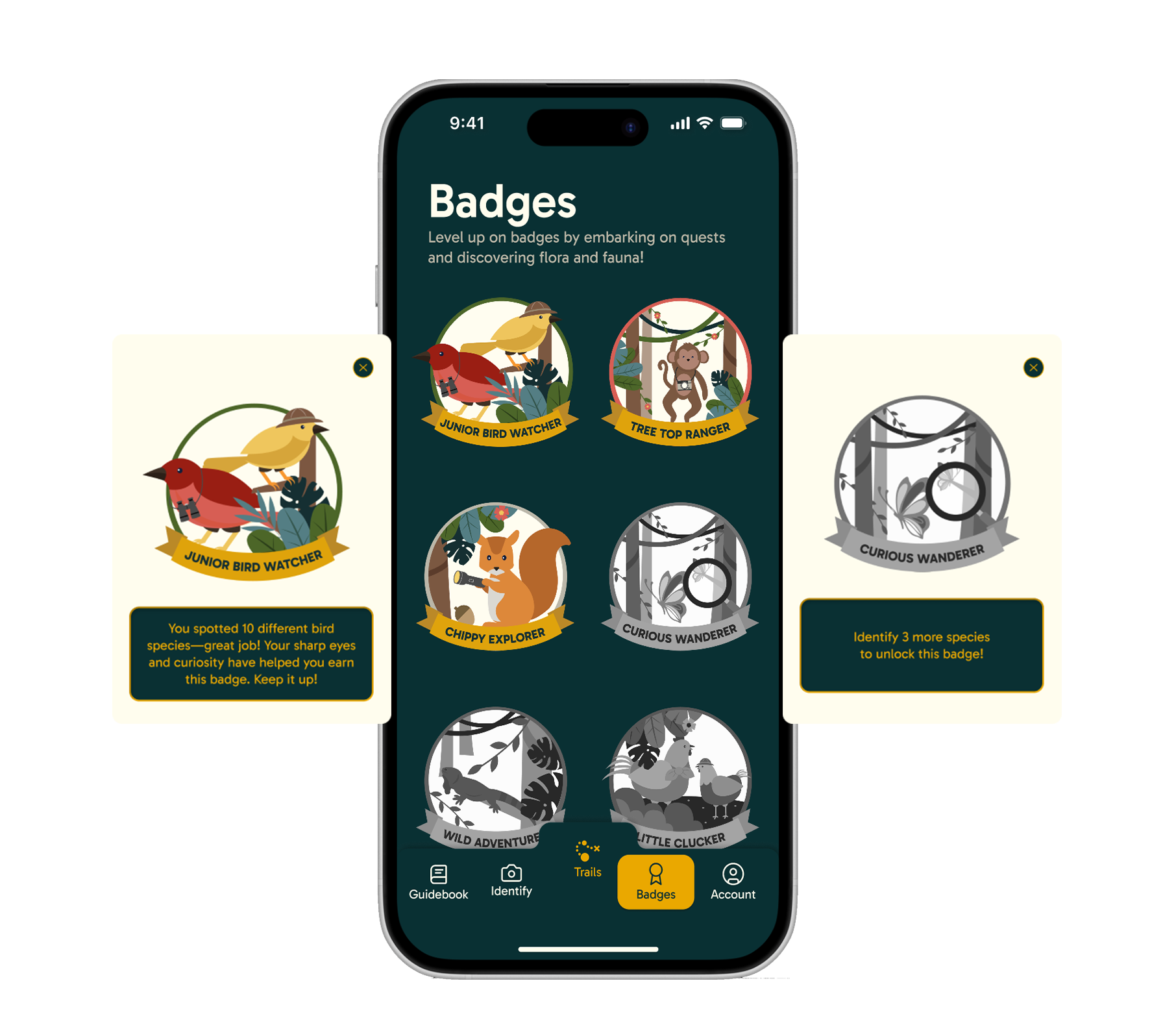 The app’s branding adopts a playful and uplifting tone inspired by nature guidebooks and gamified interfaces, making it appealing to both children and parents. Bright illustrations,